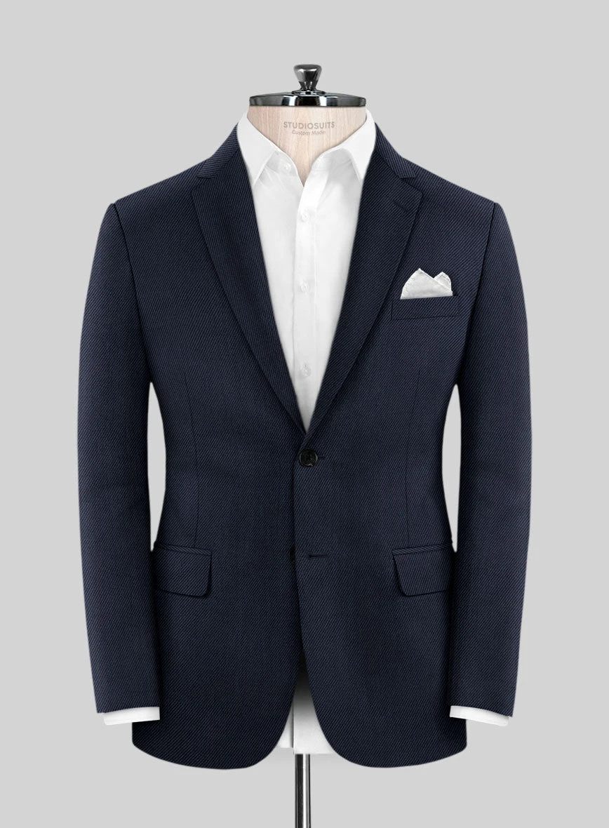 Look features a 2 button jacket with notch lapels, horn royal black buttons, single vent, three cuff buttons, and two welted back pockets on trousers.