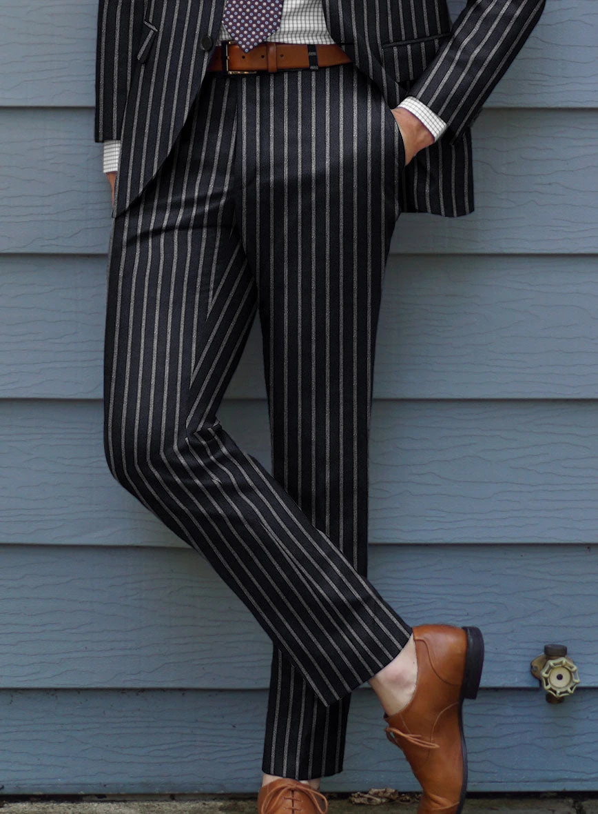 Look features a 2 button jacket with notch lapels, horn royal black buttons, single vent, three cuff buttons, and two welted back pockets on trousers.